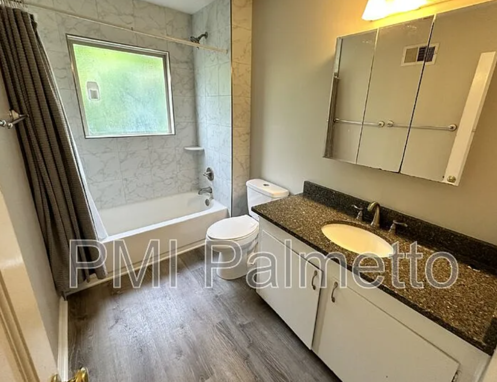 The full bath has been completely renovated with LVP flooring and granite countertop.