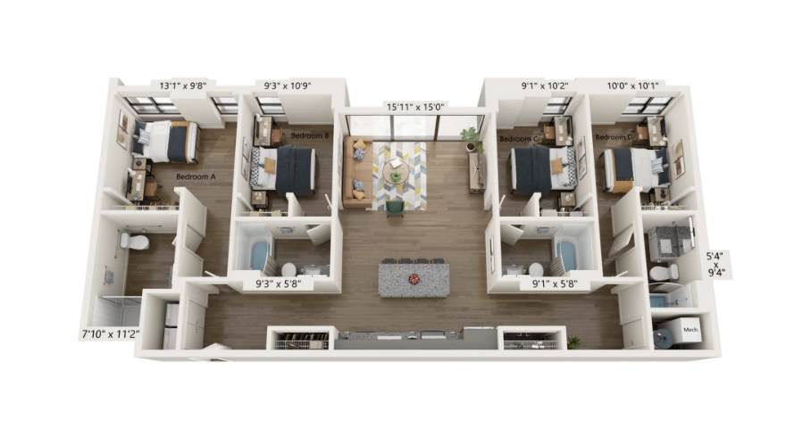 Bedroom D is to the far right of this image.